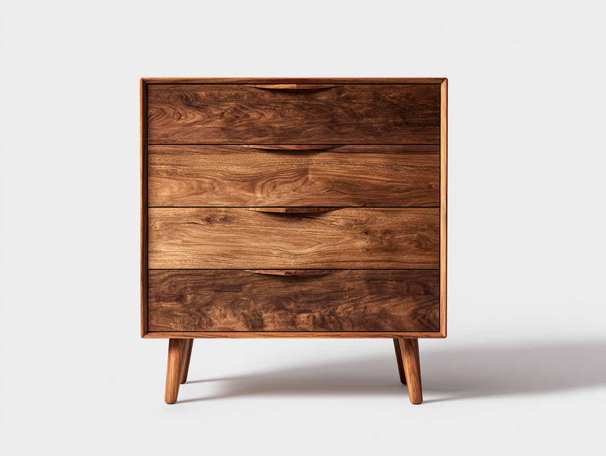 Constructed from solid wood with a walnut colour finish, the surface highlights distinctive natural grain patterns. The integrated handle design enhances the smooth front appearance while maintaining ease of use. The structure is built for stability with angled solid wood legs for added support.